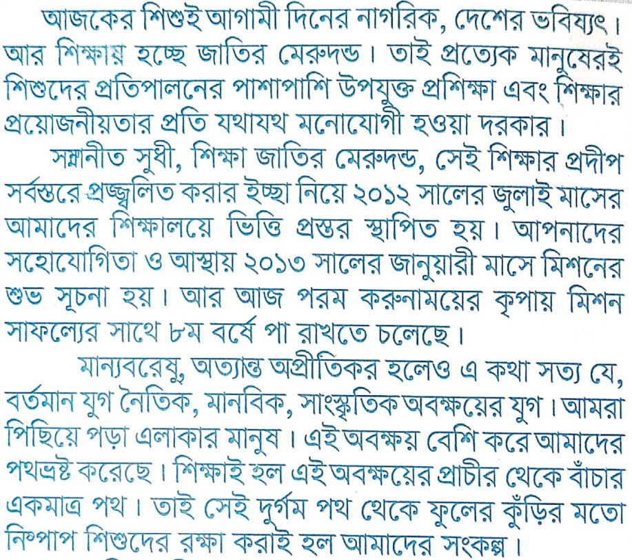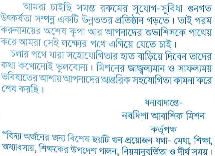 "I would like to greet good wishes, love and compassion from my bottom of heart on behalf of Nabo Didha Abashik Mission". On our knowledge and experience, we are continuously building the best further better environment for quality education and great happy path for up bringing your child with education, moral and cultural fulfilment."